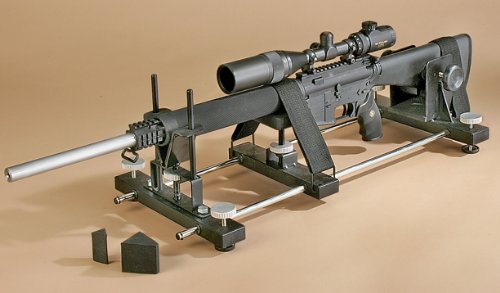 Hyskore Parallax Cleaning and Sighting Vise. Double duty! Here's everything you need to keep your rifle clean and hair - splitting accurate! Sight-in in 5 shots or less! Simply fire 3-5 shots at a fixed point, clamp your shooter in the Vise, center the reticle, and adjust the sight... just like that, you've mechanically and optically aligned the points of aim and impact. In other words, you're on target! And when you're done sighting in, the Rest "moonlights" as a cleaning vise. Comes complete with utility tray for chemicals, brushes, etc. Invaluable at the range, handy at home, a great value no matter how you shake it! Shoot: Padded rear vise and front rest; Up to 21" of adjustment; Adjustable mid-point support; Welded steel construction; 4 point leveling; Cleaning tray included. Order yours today! Hyskore Parallax Cleaning and Sighting Vise1. This page is a participant in the Amazon Services LLC Associates Program, an affiliate advertising program designed to provide a means for sites to earn advertising fees by advertising and linking to amazon.com
